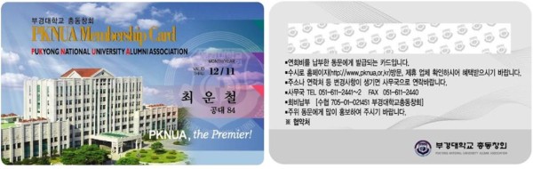 국립부경대학교 동문으로서 자긍심을 더욱 높이고, 동문들께 보다 많은 혜택을 드리고자 『부경대학교 총동창회 회원카드』 발급을 시행하고 있습니다.