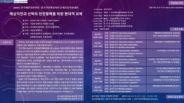 한국해양경찰학회(학회장 임석원)와 한국치안행정학회(학회장 박주상)의 2024년도 춘계공동학술대회가 부산 국립부경대학교에서 개최된다.