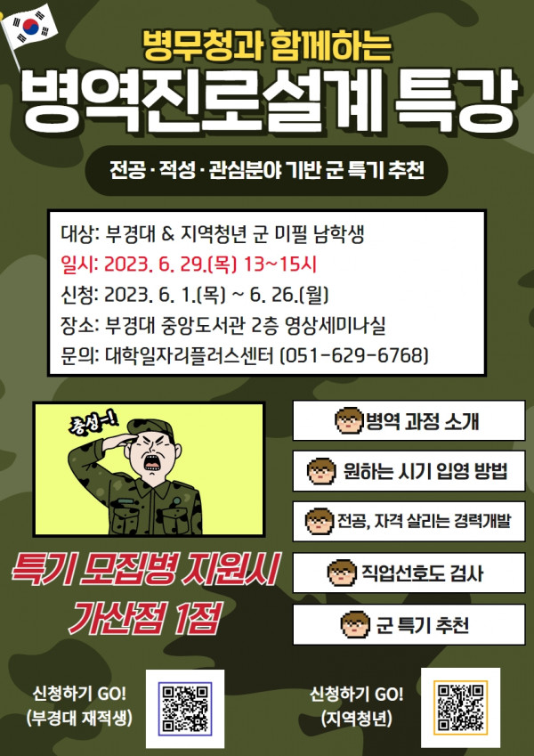 한편 부경대 대학일자리플러스센터(051-629-6768)는 최근 부산·울산지방병무청 병역진로설계지원센터와 협약을 맺고 이번 프로그램을 마련하는 등 지역을 대상으로 다양한 취·창업 및 진로지원사업을 펼치고 있다.