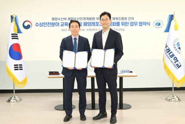 국립부경대학교 체육진흥원(원장 김영훈)과 해양수산부 해양수산인재개발원(원장 양병채)은 19일 오후 부경대 수상레저관 4층 안전교육실에서 수상 안전 분야 교육 강화를 위한 업무협약을 체결했다.