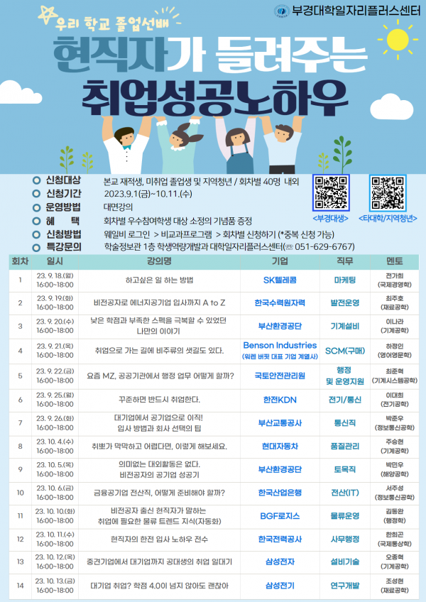 부경대는 취업 성공사례를 지역에 확산하기 위해 재학생들은 물론, 취업 준비 중인 졸업생과 지역 청년에게도 프로그램을 개방해 무료 참여 기회를 제공한다.