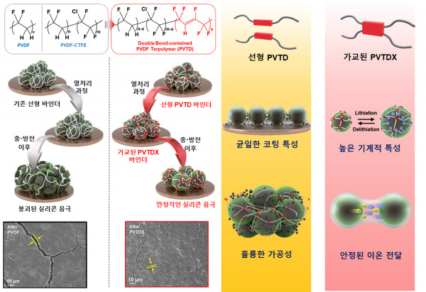 연구팀은 이차전지 등 차세대 배터리에 사용되는 실리콘 음극재에 사용되는 삼차원 네트워크의 형태를 갖춘 불소계 고분자 물질 PVDF 기반의 가교형 공중합체 바인더를 개발해 이 같은 성과를 거뒀다.