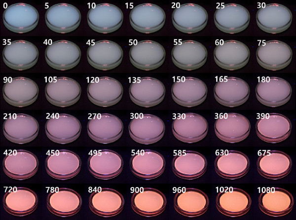 ※ 붙임: 1. 양현경 교수 2. 자외선 조사 시간(0~1080분)에 따른 필름 색 변화 이미지