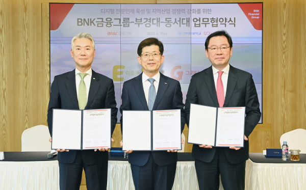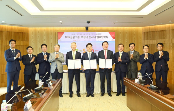국립부경대학교(총장 장영수)와 BNK금융그룹(회장 빈대인), 동서대학교(총장 장제국)는 7일 오후 부산은행 본점(부산 문현동) 20층 대회의실에서 디지털금융 인재 양성을 위한 글로컬 산학협력 협약을 체결했다.