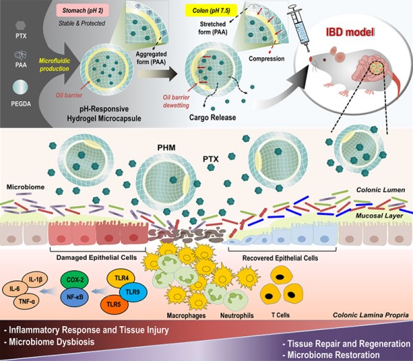 이를 극복하기 위해 연구팀은 약물을 머리카락 굵기 수준의 미세캡슐에 담아, 위에서는 안정적으로 보호되고 대장에 도달했을 때만 선택적으로 방출되는 pH 반응형 전달 시스템을 개발했다.