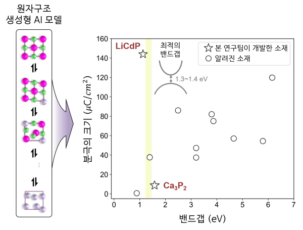그 결과, Ca3P2(인화칼슘)와 LiCdP(리튬카드뮴인화물) 두 가지 유망 물질을 도출했으며, 이들 물질은 전기적 절연성과 함께 외부 자극에 따라 전기적 분극 (Electric polarization) 상태를 전환할 수 있는 강유전체(強誘電體) 물질의 특성을 보여 차세대 메모리 소자로서의 가능성을 확인했다.