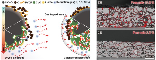 2. 드라이 전극(DE)과 캘린더링 전극(CE) 간 기공 구조 차이에 따른 환원 가스 포집 및 반응성 차이 모식도 및 단면 이미지